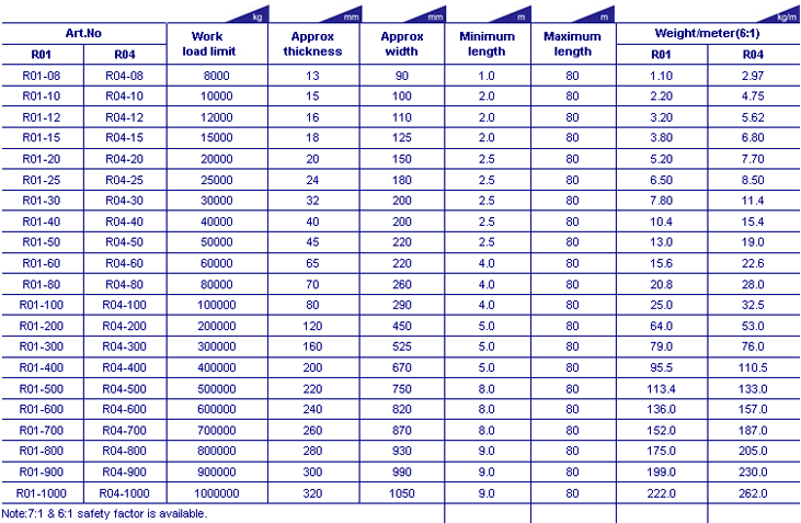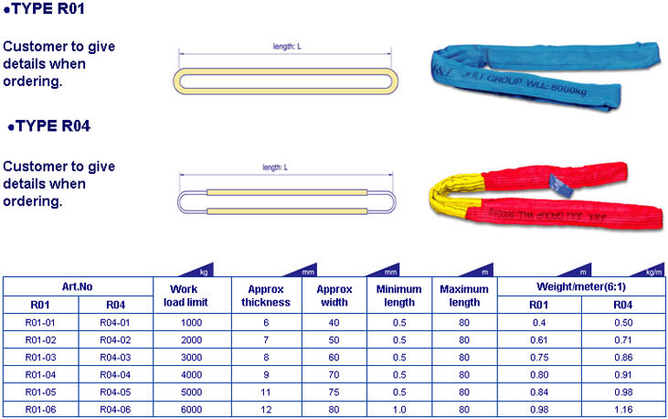 Specifications of Round Slings of Type R01 and Type R04 Specifications of Round Slings of Type R02 Specifications of Round Slings of Type R03 Specifications of Round Slings of Type R05 and Type R06 Specifications of Round Slings of Type RL Specifications of Round Slings of Type RH01